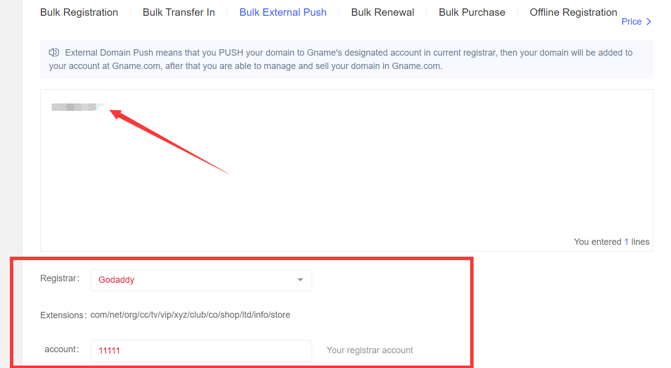 2.Select registrar, fill in your corresponding registrar account and domain list, then click [Search]. The query status is divided into [available] and [unavailable], check the available domain and click [PUSH in Now].