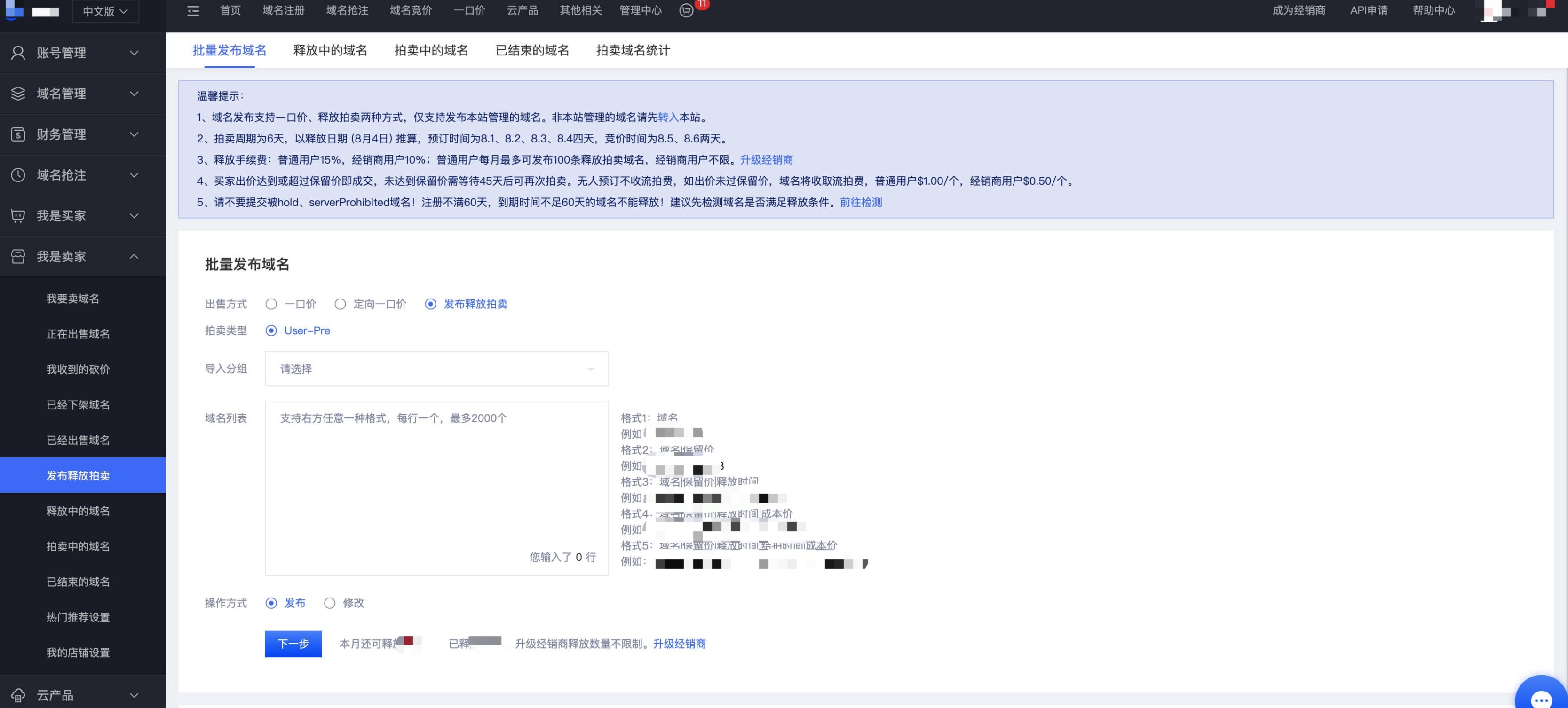 (2)普通用户每月最多可发布100条释放拍卖域名,经销商用户不限制。