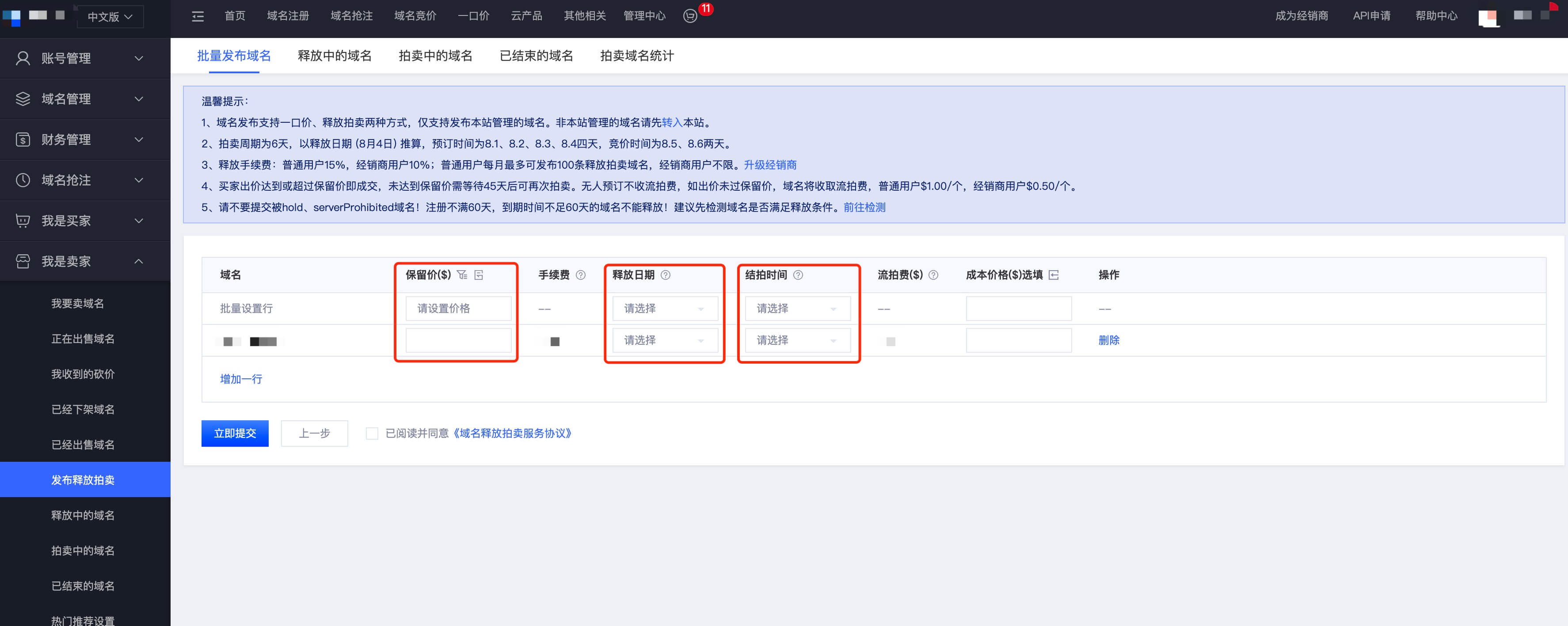 如果您的域名需要发布释放拍卖,请参考以下流程: