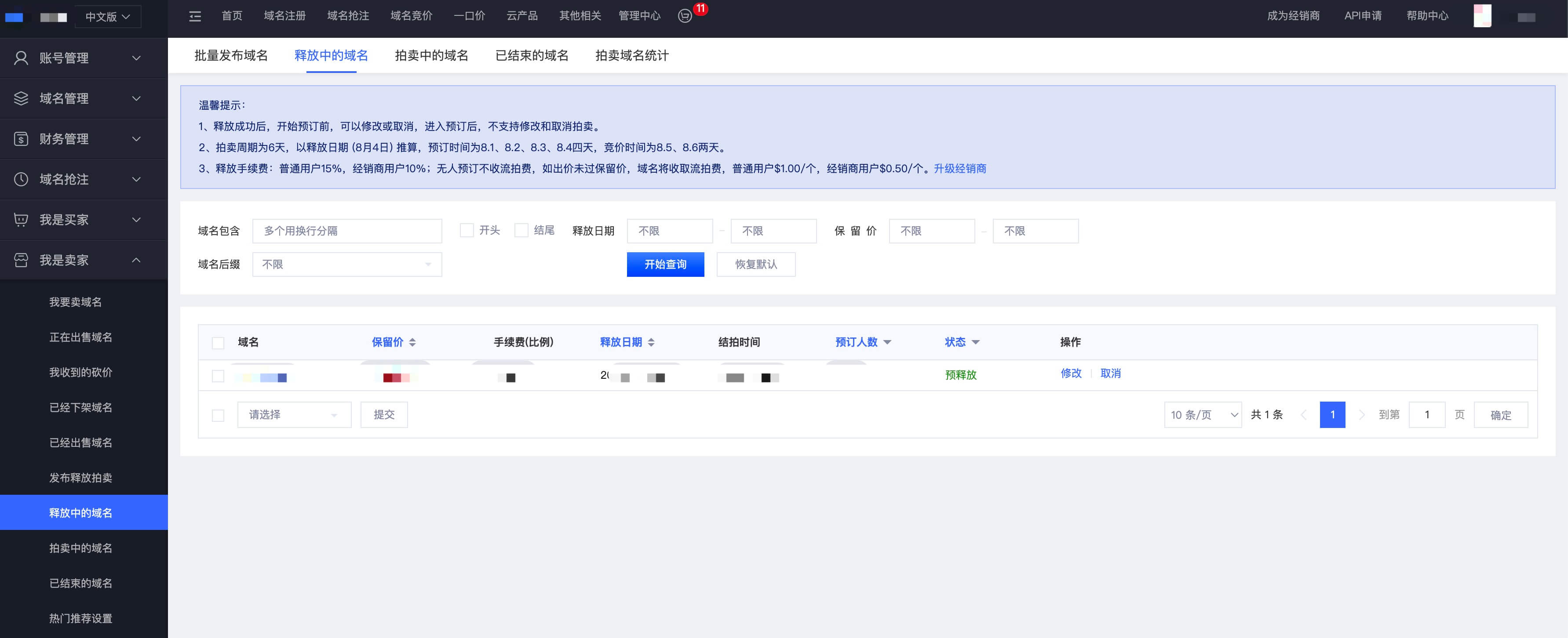 发布成功后,您可在【释放中的域名】查看域名的释放状态。