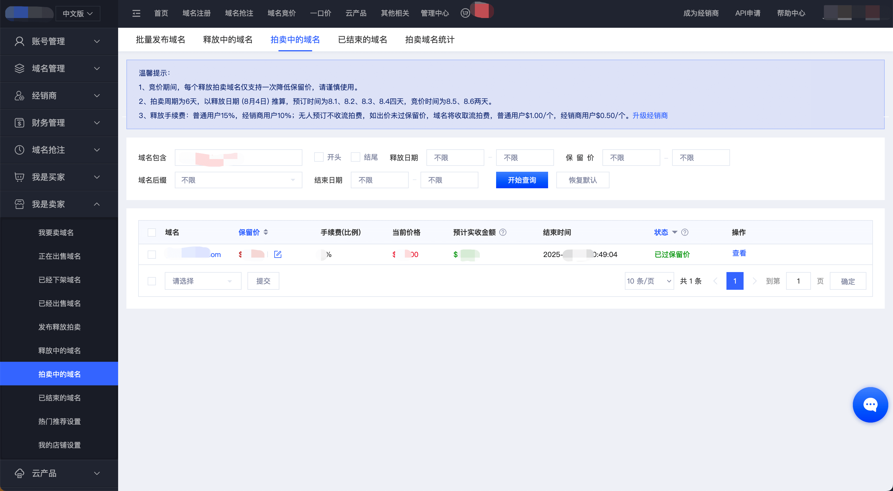 ① 每个释放拍卖域名仅支持一次降低保留价,请谨慎使用。