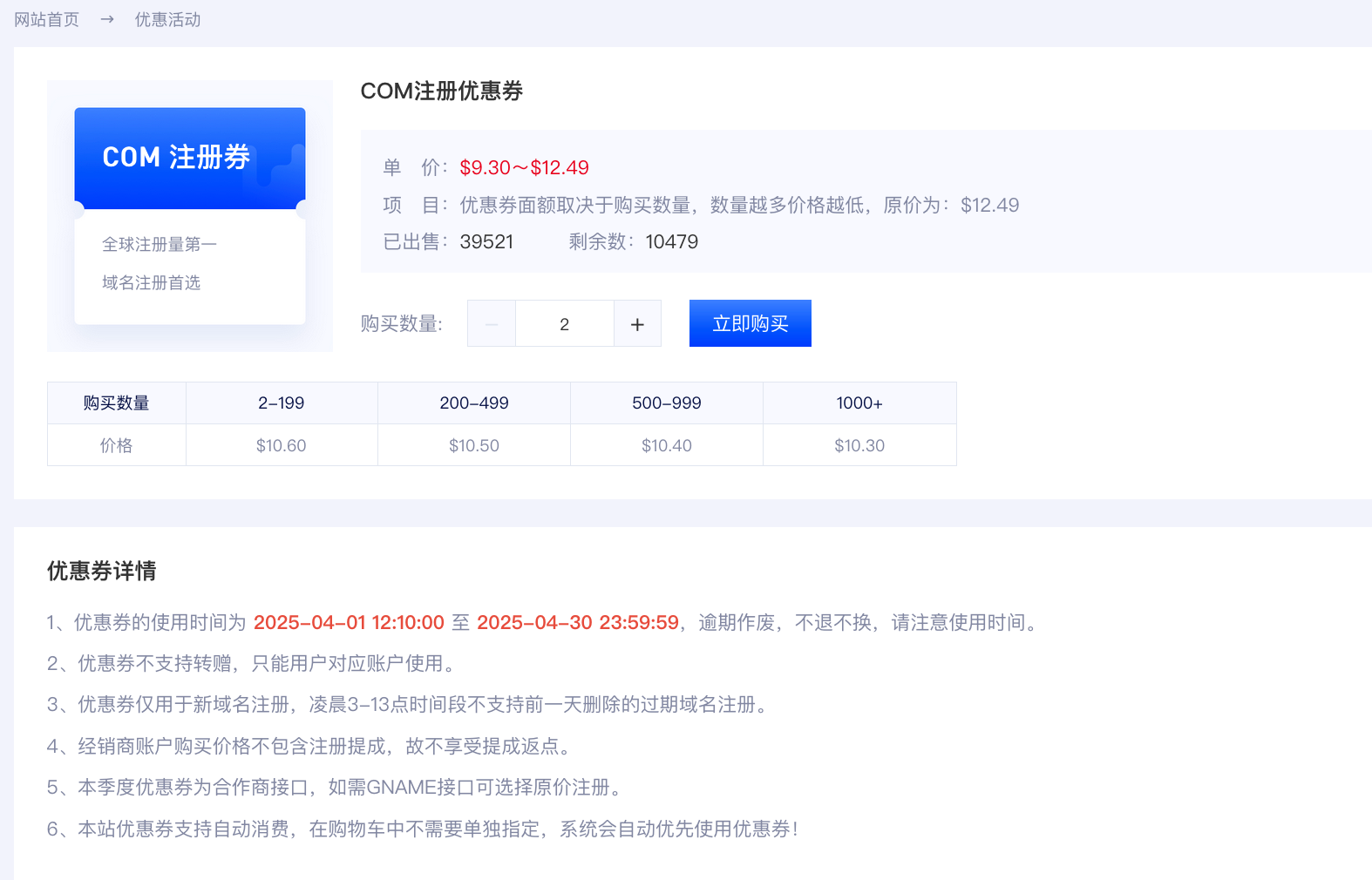 1、在本站的优惠券购买活动页面,选择您需要的优惠券;在进行消费时,优惠券会自动抵扣。假如您想要注册一个.COM后缀的域名,那么您需要选择购买COM注册券;